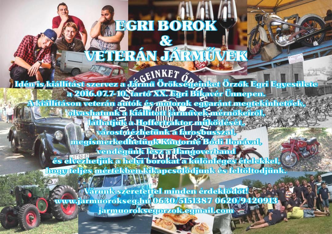 Idén is kiállítást szervez a Jármű Örökségeinket Őrzők Egri Egyesülete a 2016.07.7-10. tartó XX. Egri Bikavér Ünnepen. A kiállításon veterán autók és motorok egyaránt megtekinthetőek, olvashatunk a kiállított járművek mérnökeiről, láthatjuk a Hoffertraktor működését, várost nézhetünk a farosbusszal, megismerkedhetünk Kántorné Bódi Ilonával.
